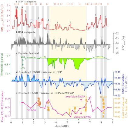 该成果基于对湖北省长阳县境内和尚洞石笋的环境磁学研究,发现该石笋中来自于洞顶土壤的软磁组分通量(IRMsoft_flux)能够反映降雨量变化,以此重建的长江中游地区过去9000年以来降雨量曲线与湖北神农架大九湖泥炭中藿烷通量所指示的泥炭地水位变化曲线(图1c)十分吻合,揭示出该区全新世以来的古水文表现出千年尺度的三段式变化:6.7-3.4kaBP是相对比较干的时期,而在这之前和之后都表现出相对潮湿的气候(图1c),并与千年尺度的ENSO活动强度相关。更为重要的是,这一参数还表现出许多更短时间尺度的变化,而且其峰值与已知的该区古洪水事件(图1a中的数字)在时间上基本吻合,证实该参数响应了短时间尺度的区域强降雨(暴雨)事件。这些强降雨事件呈现显著的500年周期变化(置信度大于99%),并与ENSO变化和太阳活动周期存在显著相关性,表现为暴雨事件主要发生在强ENSO活动(图1 d,e)和弱太阳活动时期。本成果是依据石笋记录,第一次报道了暴雨事件及其驱动机制。石笋虽然是当前全球变化研究的最重要载体之一,但因磁学信号很弱,很难开展研究。本团队成员是国际上最早开展石笋磁学与全球变化研究的集体。